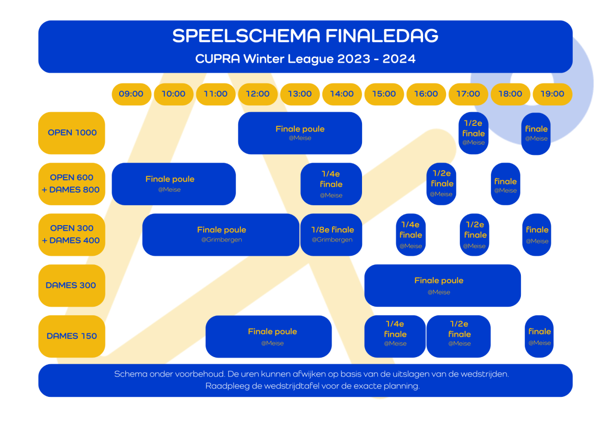 Opgepast: Open 300 + dames 400 - de finale poule & 1/8 finale verloopt in Arenal Grimbergen, vanaf de 1/4 finale verloopt alles in Arenal Meise!